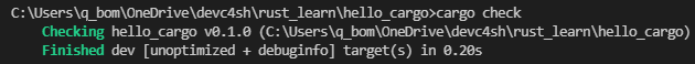 추가로 cargo check 명령어를 제공된다. 이 명령어는 코드가 컴파일 되는지 확인여부만 확인하고 실행파일은 생성되지않는다.