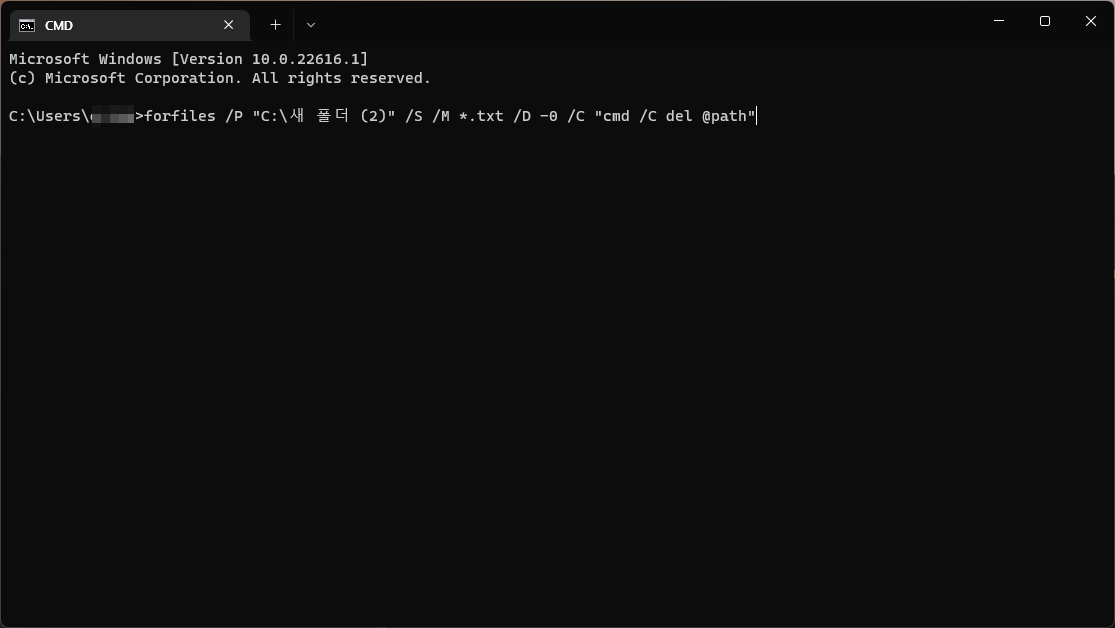 forfiles /P "C:\새 폴더 (2)" /S /M *.txt /D -0 /C "cmd /C del @path"