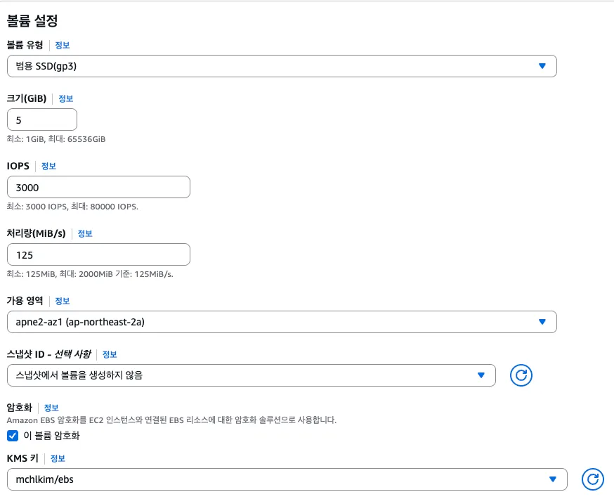 테스트를 위해 볼륨을 아래와 같은 옵션으로 생성