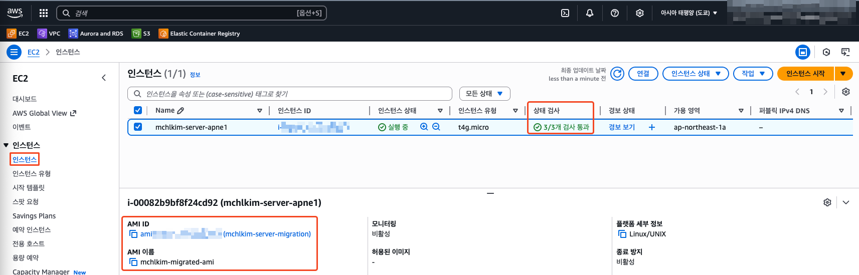10. 대상 리전에서 마이그레이션된 AMI를 사용하여 인스턴스를 시작