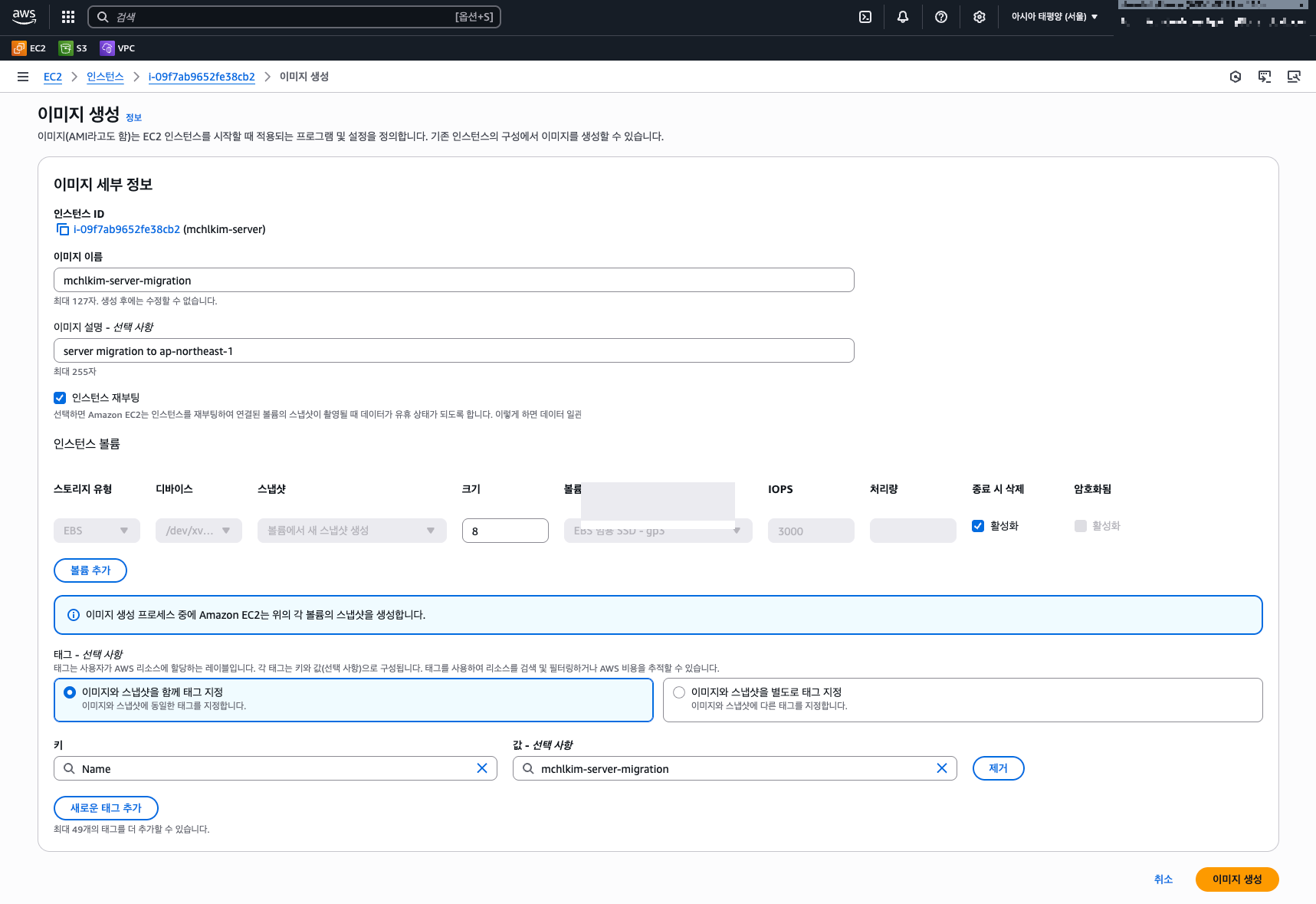 - 동일 계정 또는 다른 계정의 다른 리전으로 이동하려는 서버의 AMI를 생성b. 작업, 이미지 및 템플릿 그리고 이미지 생성 선택
