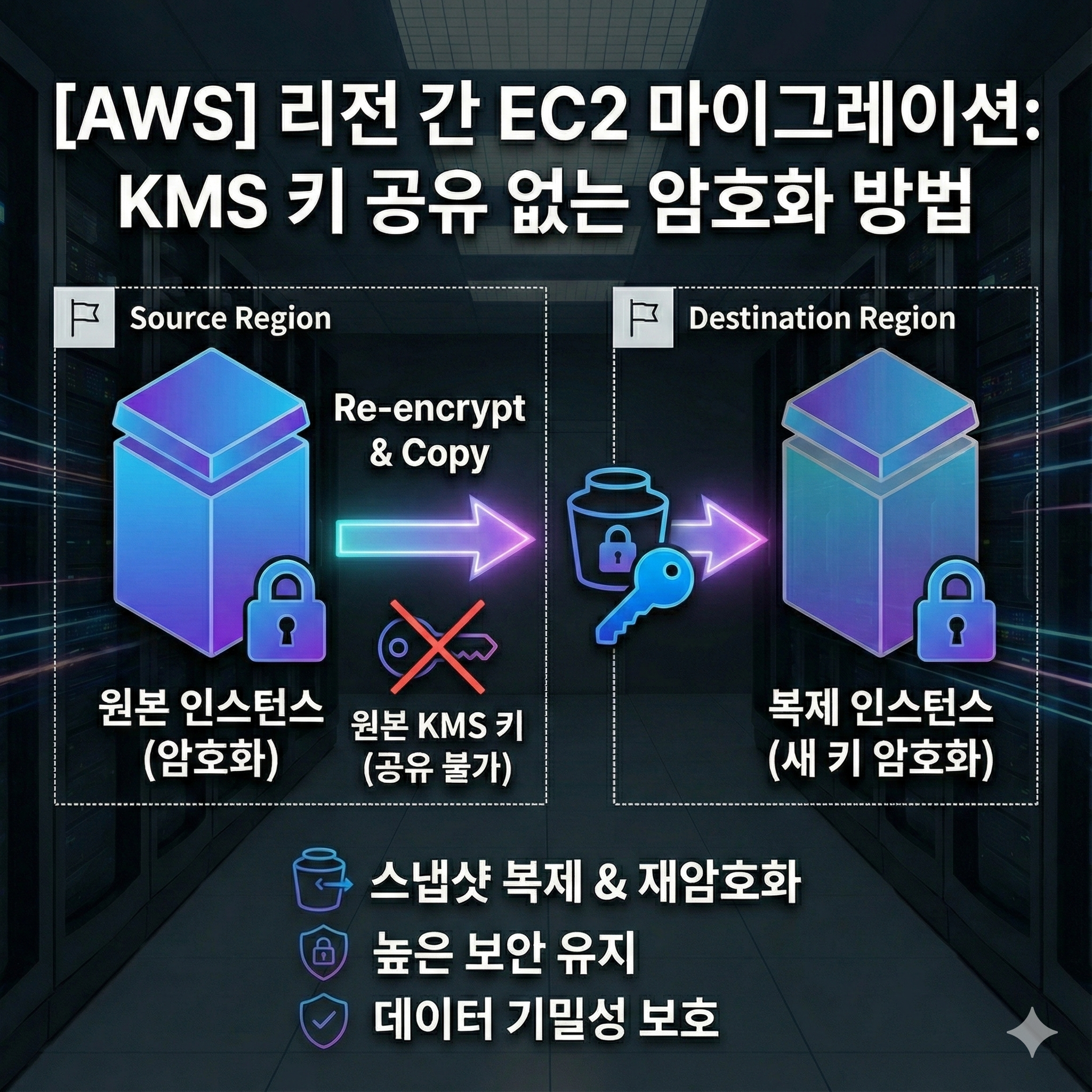 본 포스팅에서는 AWS KMS 키를 공유하지 않고 암호화된 EC2 인스턴스를 리전 간에 안전하게 마이그레이션하는 단계별 접근 방법을 소개합니다.